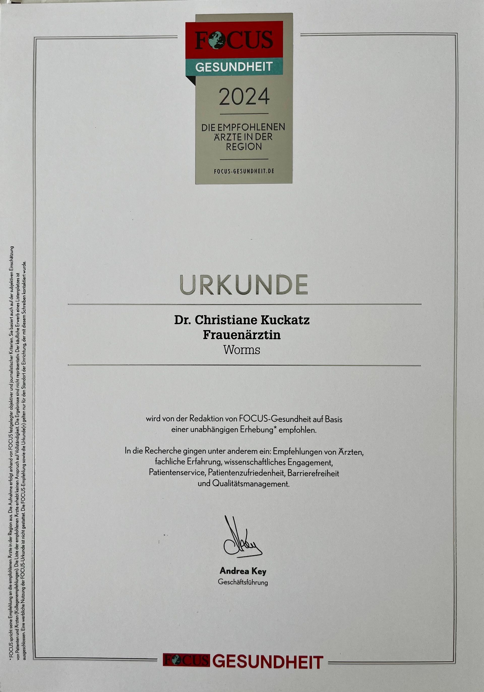 wie bereits in den Jahren zuvor, so auch in der Fokus Ausgabe 2024 - der unabhängigen Erhebung „Focus-Gesundheit“ wird Dr. Thomas Herbel und auch Frau Dr. Christiane Kuckatz als erfahrene Ärzte in Worms im Bereich “Frauenarzt/Frauenärztin” empfohlen.