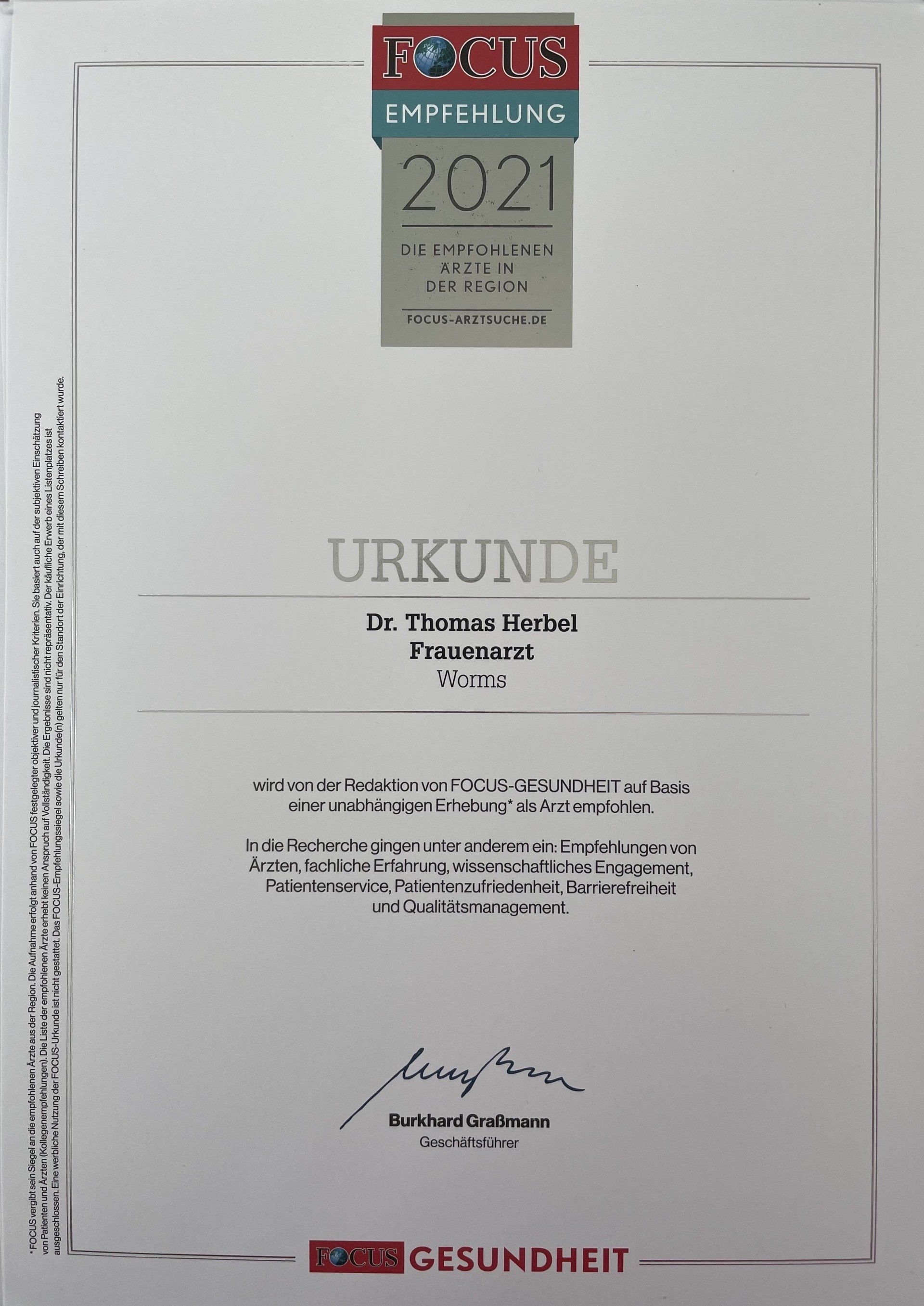 wie bereits in den Jahren zuvor, so auch in der Fokus Ausgabe 2024 - der unabhängigen Erhebung „Focus-Gesundheit“ wird Dr. Thomas Herbel und auch Frau Dr. Christiane Kuckatz als erfahrene Ärzte in Worms im Bereich “Frauenarzt/Frauenärztin” empfohlen.